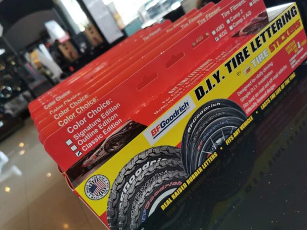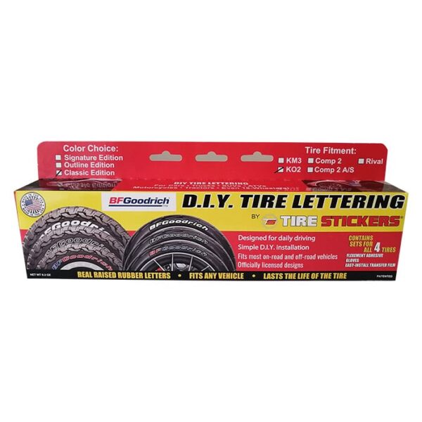 BFGoodrich® se ha asociado exclusivamente con Tire Stickers® para presentar BFGoodrich® Tire Letters. Desarrolladas en colaboración con entusiastas y equipos de deportes de motor, y fabricadas en los EE. UU., estas letras de caucho en relieve se adhieren a las paredes laterales de las llantas sobre las letras negras existentes con verdadera resistencia (diseñadas para soportar las condiciones más exigentes y las temperaturas más altas). El producto está diseñado para durar la vida útil de la llanta en la conducción diaria y en la mayoría de las condiciones fuera de la carretera.